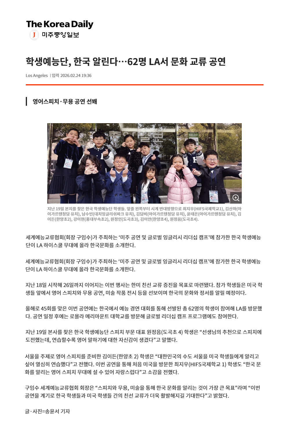 ÇÑ»ý¿¹´É´Ü,Çѱ¹ ¾Ë¸°´Ù. LA¼ ¹®È ±³·ù °ø¿¬-¹ÌÁÖÁß¾ÓÀϺ¸LA(26.02)