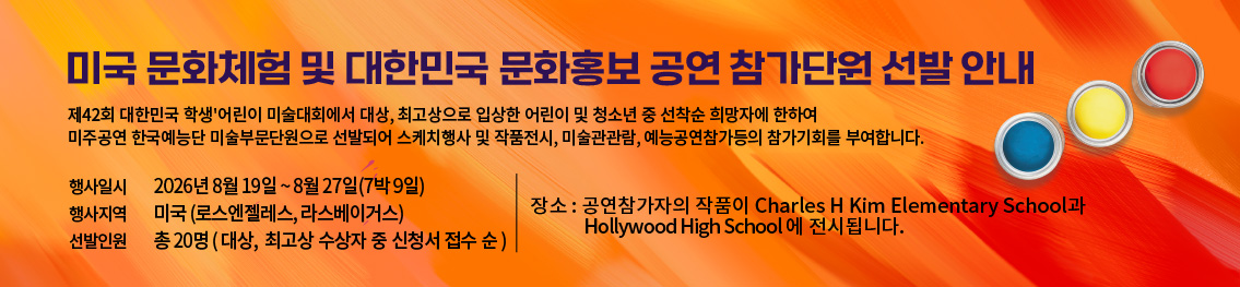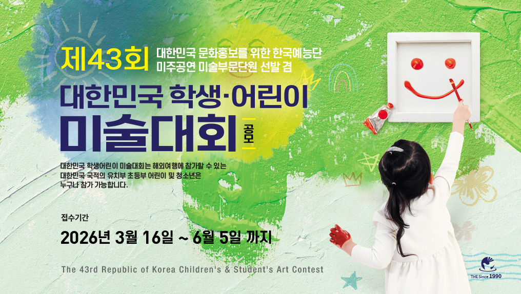 Á¦43ȸ ´ëÇѹα¹ Çлý'¾î¸°ÀÌ ¹Ì¼ú´ëȸ¿¡¼ ´ë»ó ¹× ÃÖ°í»ó ¼ö»óÀÚ´Â ¹Ì±¹ÀÇ LA °ø¿¬Àå¿¡¼ ½Ç½ÃµÇ´Â´ëÇѹα¹ ¹®ÈÈ«º¸ °ø¿¬´ÜÀÇ ÀÏ¿øÀ¸·Î Âü°¡ÇÒ ¼ö Àִ Ưº°ÇÑ ±âȸ°¡ ÁÖ¾îÁý´Ï´Ù.