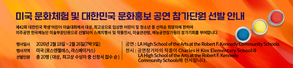 Á¦42ȸ ´ëÇѹα¹ Çлý'¾î¸°ÀÌ ¹Ì¼ú´ëȸ¿¡¼ ´ë»ó ¹× ÃÖ°í»ó ¼ö»óÀÚ´Â ¹Ì±¹ÀÇ LA °ø¿¬Àå¿¡¼ ½Ç½ÃµÇ´Â´ëÇѹα¹ ¹®ÈÈ«º¸ °ø¿¬´ÜÀÇ ÀÏ¿øÀ¸·Î Âü°¡ÇÒ ¼ö Àִ Ưº°ÇÑ ±âȸ°¡ ÁÖ¾îÁý´Ï´Ù.